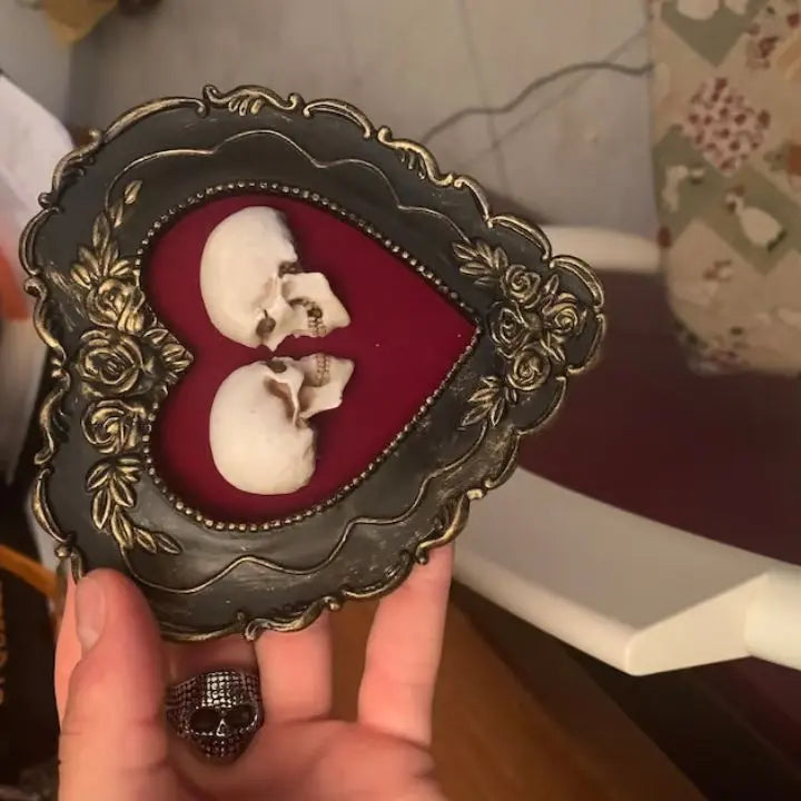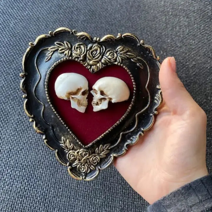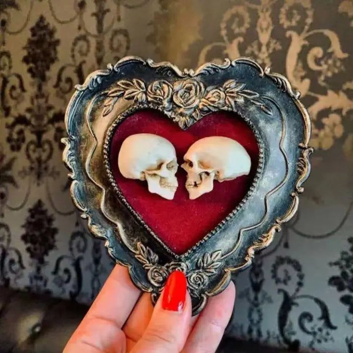 Zeigen Sie Ihre unsterbliche Liebe zum Valentinstag oder zu jedem Anlass mit diesem exquisit gerahmten Miniatur-Menschenschädel-Set. Handgefertigt mit Liebe, symbolisiert dieses einzigartige Stück Liebe, die sogar über den Tod hinausgeht. Mit detaillierter Kunstfertigkeit und einem vintage Herzrahmen ist es das perfekte Geschenk für jemand Besonderen.